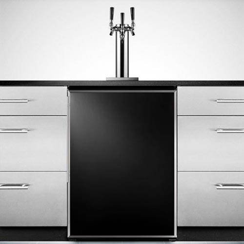 SUMMMIT's SBC490BI7 series features Built-In undercounter beer dispensers made with durable construction and innovative design The SBC490BI7FRTRIPLE lets users accommodate all tastes with three different drafts from a triple tap tower. Half, quarter, and mini kegs can be used inside. We include a complete tap kit and 5 lb. CO2 tank for all your service needs Designed primarily for Built-In use, the SBC490BI7FRTRIPLE can be installed in 24" spaces and under standard counters. It can also be used freestanding and ships with sturdy casters that allow easy mobility. The jet black exterior includes a two-piece stainless steel door frame that accepts slide-in panels (panel size: 31 x 23-3 8). This elegant design allows users to customize the unit's front to match other cabinetry. A stainless steel handle is included Removable shelves allow the beer dispenser to be used as an all-purpose refrigerator. Automatic defrost operation conveniently helps to keep maintenance down to a minimum The SBC490BI7FRTRIPLE is commercially approved (ETL-S listed to NSF-18) and makes an ideal addition to bars, restaurants, and any other establishment in need of a top quality beer dispenser at an affordable price,Commercially approved - ETL-S Listed to NSF-18 Full-sized beer dispenser - Interior accommodates half, quarter, or mini (pony) kegs Built-In capable - Make the best use of space by installing your appliance under the counter and flush with other cabinetry Fully finished black cabinet - Allows the unit to be used freestanding Stainless steel door frame - Slide a panel into this two-piece exposed stainless steel door frame to match the unit to other cabinetry (panel size: 31 H x 23-3 8 W) Professional handle - Stainless steel handle for