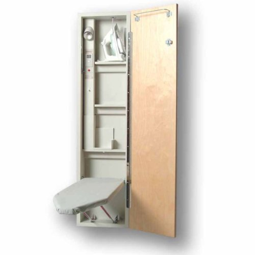 Open the door, lower the board, and you're ready to iron, even in tight areas! In today's busy lifestyles, a built-in ironing center helps your home function more efficiently and with less effort. This Recessed Ironing Center with Unfinished Birch Door is the top of the line and is designed to install recessed into your wall with the cabinet flush with the wall. You will appreciate the premium set of features, allowing for the utmost ease and comfort when ironing. The telescoping steel support legs provide the rugged stability necessary when ironing with the superlative 46" length board. A 4" height adjustment lets you choose the most comfortable work position. A sixty minute LED digital timer turns on power to the built-in work light and the electrical outlet. The electrical cord cover and restraints help guide the cord over the board, eliminating potential snags. You can leave your iron plugged in at all times, even when the door is closed. A built-in safety switch disconnects all power when the board is returned to the upright position. The oversized hot iron storage compartment, iron rest, storage shelves, garment bar, and indicator light are the standard accessories completing this supreme ironing center. All models come standard with a birch door, and all wood doors come unfinished so that they can be painted or stained to match your decor. Pre-assembled and ready to install into your wall. Unit can be provided with a left hinged door upon request."
